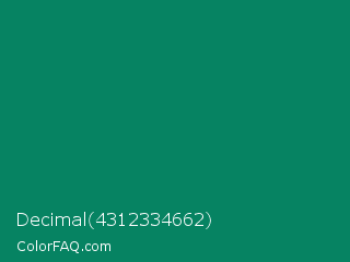 Decimal 4312334662 Color is a dark cyan color and the nearest color is Generic Viridian #007f66. Hex code #068362 and RGB value is rgb(6,131,98). In RGB color space, this color is composed of 2% red, 51% green, 38% blue, In CMYK color space, this color is composed of 95% cyan, 0% magenta, 25% yellow , 49% black , In HSL color space, this color has a hue angle of 164° , 91% saturation and 27% lightness.