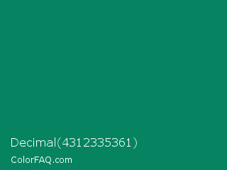 Decimal 4312335361 Color is a dark green color and the nearest color is Spanish Viridian #007f5c. Hex code #068461 and RGB value is rgb(6,132,97). In RGB color space, this color is composed of 2% red, 52% green, 38% blue, In CMYK color space, this color is composed of 95% cyan, 0% magenta, 27% yellow , 48% black , In HSL color space, this color has a hue angle of 163° , 91% saturation and 27% lightness.