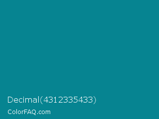 Decimal 4312335433 Color is a dark cyan color and the nearest color is Blue Chill #0c8990. Hex code #068491 and RGB value is rgb(6,132,145). In RGB color space, this color is composed of 2% red, 52% green, 57% blue, In CMYK color space, this color is composed of 96% cyan, 9% magenta, 0% yellow , 43% black , In HSL color space, this color has a hue angle of 186° , 92% saturation and 30% lightness.