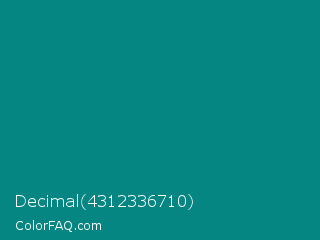 Decimal 4312336710 Color is a dark cyan color and the nearest color is Teal Green #00827f. Hex code #068682 and RGB value is rgb(6,134,130). In RGB color space, this color is composed of 2% red, 53% green, 51% blue, In CMYK color space, this color is composed of 96% cyan, 0% magenta, 3% yellow , 47% black , In HSL color space, this color has a hue angle of 178° , 91% saturation and 27% lightness.