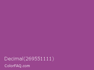 Decimal 269551111 Color is a normal magenta color and the nearest color is Plum #8e4585. Hex code #9a468f and RGB value is rgb(154,70,143). In RGB color space, this color is composed of 60% red, 27% green, 56% blue, In CMYK color space, this color is composed of 0% cyan, 55% magenta, 7% yellow , 40% black , In HSL color space, this color has a hue angle of 308° , 38% saturation and 44% lightness.
