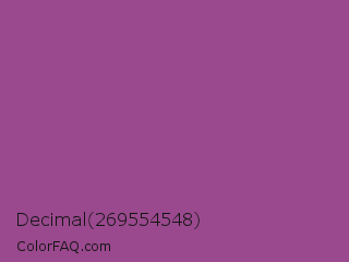 Decimal 269554548 Color is a normal magenta color and the nearest color is Plum #8e4585. Hex code #9a498e and RGB value is rgb(154,73,142). In RGB color space, this color is composed of 60% red, 29% green, 56% blue, In CMYK color space, this color is composed of 0% cyan, 53% magenta, 8% yellow , 40% black , In HSL color space, this color has a hue angle of 309° , 36% saturation and 45% lightness.