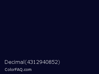 Decimal 4312940852 Color is a almost black blue color and the nearest color is Deep Ebony #0c0b1d. Hex code #070826 and RGB value is rgb(7,8,38). In RGB color space, this color is composed of 3% red, 3% green, 15% blue, In CMYK color space, this color is composed of 82% cyan, 79% magenta, 0% yellow , 85% black , In HSL color space, this color has a hue angle of 238° , 69% saturation and 9% lightness.