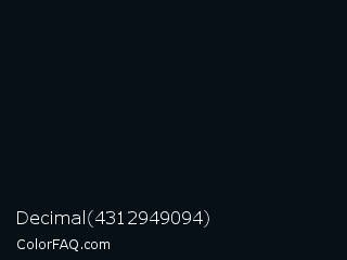 Decimal 4312949094 Color is a almost black blue color and the nearest color is Bunker #0d1117. Hex code #071016 and RGB value is rgb(7,16,22). In RGB color space, this color is composed of 3% red, 6% green, 9% blue, In CMYK color space, this color is composed of 68% cyan, 27% magenta, 0% yellow , 91% black , In HSL color space, this color has a hue angle of 204° , 52% saturation and 6% lightness.
