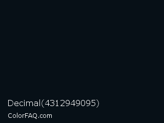 Decimal 4312949095 Color is a almost black blue color and the nearest color is Bunker #0d1117. Hex code #071017 and RGB value is rgb(7,16,23). In RGB color space, this color is composed of 3% red, 6% green, 9% blue, In CMYK color space, this color is composed of 70% cyan, 30% magenta, 0% yellow , 91% black , In HSL color space, this color has a hue angle of 206° , 53% saturation and 6% lightness.