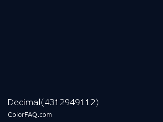 Decimal 4312949112 Color is a almost black blue color and the nearest color is Black Pearl #041322. Hex code #071022 and RGB value is rgb(7,16,34). In RGB color space, this color is composed of 3% red, 6% green, 13% blue, In CMYK color space, this color is composed of 79% cyan, 53% magenta, 0% yellow , 87% black , In HSL color space, this color has a hue angle of 220° , 66% saturation and 8% lightness.