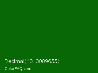 Decimal 4313089655 Color is a very dark green color and the nearest color is Japanese Laurel #0a6906. Hex code #076805 and RGB value is rgb(7,104,5). In RGB color space, this color is composed of 3% red, 41% green, 2% blue, In CMYK color space, this color is composed of 93% cyan, 0% magenta, 95% yellow , 59% black , In HSL color space, this color has a hue angle of 119° , 91% saturation and 21% lightness.