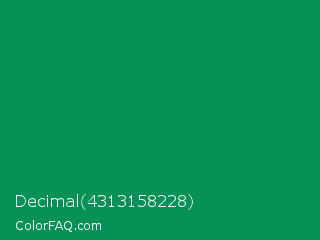 Decimal 4313158228 Color is a dark green color and the nearest color is Spanish Green #009150. Hex code #079156 and RGB value is rgb(7,145,86). In RGB color space, this color is composed of 3% red, 57% green, 34% blue, In CMYK color space, this color is composed of 95% cyan, 0% magenta, 41% yellow , 43% black , In HSL color space, this color has a hue angle of 154° , 91% saturation and 30% lightness.