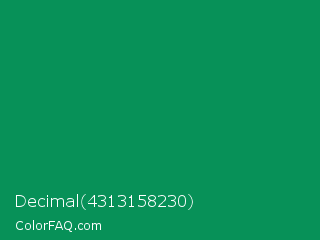 Decimal 4313158230 Color is a dark green color and the nearest color is Spanish Green #009150. Hex code #079158 and RGB value is rgb(7,145,88). In RGB color space, this color is composed of 3% red, 57% green, 35% blue, In CMYK color space, this color is composed of 95% cyan, 0% magenta, 39% yellow , 43% black , In HSL color space, this color has a hue angle of 155° , 91% saturation and 30% lightness.