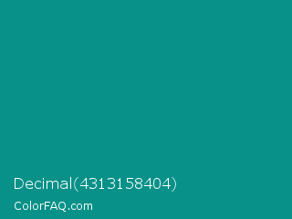 Decimal 4313158404 Color is a dark cyan color and the nearest color is Dark Cyan #008b8b. Hex code #079188 and RGB value is rgb(7,145,136). In RGB color space, this color is composed of 3% red, 57% green, 53% blue, In CMYK color space, this color is composed of 95% cyan, 0% magenta, 6% yellow , 43% black , In HSL color space, this color has a hue angle of 176° , 91% saturation and 30% lightness.