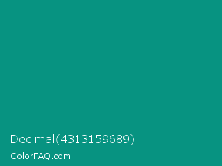 Decimal 4313159689 Color is a dark cyan color and the nearest color is Gossamer #069b81. Hex code #079381 and RGB value is rgb(7,147,129). In RGB color space, this color is composed of 3% red, 58% green, 51% blue, In CMYK color space, this color is composed of 95% cyan, 0% magenta, 12% yellow , 42% black , In HSL color space, this color has a hue angle of 172° , 91% saturation and 30% lightness.