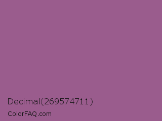 Decimal 269574711 Color is a normal magenta color and the nearest color is Strikemaster #956387. Hex code #9a5c8d and RGB value is rgb(154,92,141). In RGB color space, this color is composed of 60% red, 36% green, 55% blue, In CMYK color space, this color is composed of 0% cyan, 40% magenta, 8% yellow , 40% black , In HSL color space, this color has a hue angle of 313° , 25% saturation and 48% lightness.