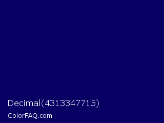 Decimal 4313347715 Color is a very dark indigo color and the nearest color is Arapawa #110c6c. Hex code #080063 and RGB value is rgb(8,0,99). In RGB color space, this color is composed of 3% red, 0% green, 39% blue, In CMYK color space, this color is composed of 92% cyan, 100% magenta, 0% yellow , 61% black , In HSL color space, this color has a hue angle of 245° , 100% saturation and 19% lightness.