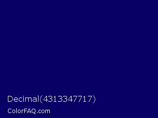 Decimal 4313347717 Color is a very dark indigo color and the nearest color is Arapawa #110c6c. Hex code #080065 and RGB value is rgb(8,0,101). In RGB color space, this color is composed of 3% red, 0% green, 40% blue, In CMYK color space, this color is composed of 92% cyan, 100% magenta, 0% yellow , 60% black , In HSL color space, this color has a hue angle of 245° , 100% saturation and 20% lightness.