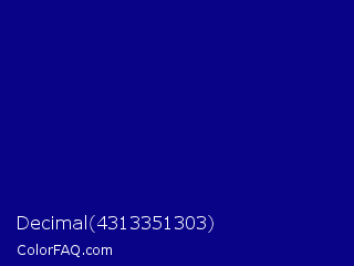 Decimal 4313351303 Color is a dark indigo color and the nearest color is Dark Blue #00008b. Hex code #080387 and RGB value is rgb(8,3,135). In RGB color space, this color is composed of 3% red, 1% green, 53% blue, In CMYK color space, this color is composed of 94% cyan, 98% magenta, 0% yellow , 47% black , In HSL color space, this color has a hue angle of 242° , 96% saturation and 27% lightness.