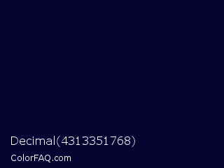 Decimal 4313351768 Color is a very dark indigo color and the nearest color is Black Rock #0d0332. Hex code #080432 and RGB value is rgb(8,4,50). In RGB color space, this color is composed of 3% red, 2% green, 20% blue, In CMYK color space, this color is composed of 84% cyan, 92% magenta, 0% yellow , 80% black , In HSL color space, this color has a hue angle of 245° , 85% saturation and 11% lightness.