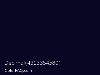 Decimal 4313354580 Color is a almost black indigo color and the nearest color is Deep Ebony #0c0b1d. Hex code #080622 and RGB value is rgb(8,6,34). In RGB color space, this color is composed of 3% red, 2% green, 13% blue, In CMYK color space, this color is composed of 76% cyan, 82% magenta, 0% yellow , 87% black , In HSL color space, this color has a hue angle of 244° , 70% saturation and 8% lightness.