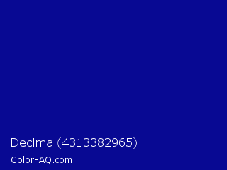Decimal 4313382965 Color is a dark blue color and the nearest color is Ultramarine #120a8f. Hex code #080993 and RGB value is rgb(8,9,147). In RGB color space, this color is composed of 3% red, 4% green, 58% blue, In CMYK color space, this color is composed of 95% cyan, 94% magenta, 0% yellow , 42% black , In HSL color space, this color has a hue angle of 240° , 90% saturation and 30% lightness.