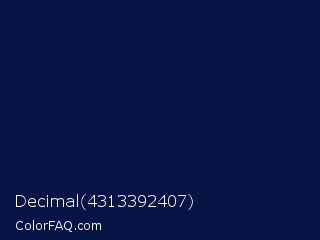 Decimal 4313392407 Color is a very dark blue color and the nearest color is Deep Cove #051040. Hex code #081345 and RGB value is rgb(8,19,69). In RGB color space, this color is composed of 3% red, 7% green, 27% blue, In CMYK color space, this color is composed of 88% cyan, 72% magenta, 0% yellow , 73% black , In HSL color space, this color has a hue angle of 229° , 79% saturation and 15% lightness.