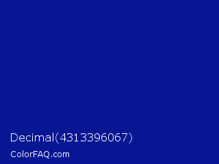 Decimal 4313396067 Color is a dark blue color and the nearest color is Indigo Dye #091f92. Hex code #081693 and RGB value is rgb(8,22,147). In RGB color space, this color is composed of 3% red, 9% green, 58% blue, In CMYK color space, this color is composed of 95% cyan, 85% magenta, 0% yellow , 42% black , In HSL color space, this color has a hue angle of 234° , 90% saturation and 30% lightness.