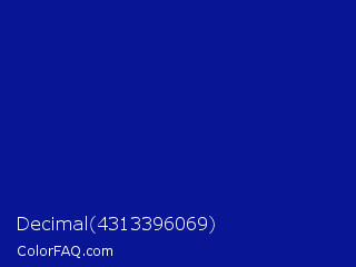 Decimal 4313396069 Color is a normal blue color and the nearest color is Indigo Dye #091f92. Hex code #081695 and RGB value is rgb(8,22,149). In RGB color space, this color is composed of 3% red, 9% green, 58% blue, In CMYK color space, this color is composed of 95% cyan, 85% magenta, 0% yellow , 42% black , In HSL color space, this color has a hue angle of 234° , 90% saturation and 31% lightness.