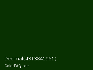 Decimal 4313841961 Color is a very dark green color and the nearest color is Deep Fir #002900. Hex code #083101 and RGB value is rgb(8,49,1). In RGB color space, this color is composed of 3% red, 19% green, 0% blue, In CMYK color space, this color is composed of 84% cyan, 0% magenta, 98% yellow , 81% black , In HSL color space, this color has a hue angle of 111° , 96% saturation and 10% lightness.