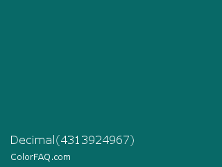 Decimal 4313924967 Color is a very dark cyan color and the nearest color is Mosque #036a6e. Hex code #086967 and RGB value is rgb(8,105,103). In RGB color space, this color is composed of 3% red, 41% green, 40% blue, In CMYK color space, this color is composed of 92% cyan, 0% magenta, 2% yellow , 59% black , In HSL color space, this color has a hue angle of 179° , 86% saturation and 22% lightness.