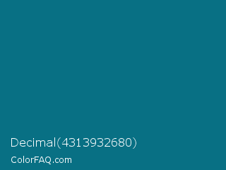 Decimal 4313932680 Color is a dark cyan color and the nearest color is Blue Lagoon #017987. Hex code #087084 and RGB value is rgb(8,112,132). In RGB color space, this color is composed of 3% red, 44% green, 52% blue, In CMYK color space, this color is composed of 94% cyan, 15% magenta, 0% yellow , 48% black , In HSL color space, this color has a hue angle of 190° , 89% saturation and 27% lightness.