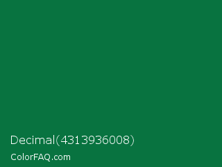 Decimal 4313936008 Color is a dark green color and the nearest color is Dartmouth Green #00703c. Hex code #087340 and RGB value is rgb(8,115,64). In RGB color space, this color is composed of 3% red, 45% green, 25% blue, In CMYK color space, this color is composed of 93% cyan, 0% magenta, 44% yellow , 55% black , In HSL color space, this color has a hue angle of 151° , 87% saturation and 24% lightness.