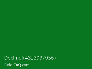 Decimal 4313937956 Color is a dark green color and the nearest color is La Salle Green #087830. Hex code #087620 and RGB value is rgb(8,118,32). In RGB color space, this color is composed of 3% red, 46% green, 13% blue, In CMYK color space, this color is composed of 93% cyan, 0% magenta, 73% yellow , 54% black , In HSL color space, this color has a hue angle of 133° , 87% saturation and 25% lightness.