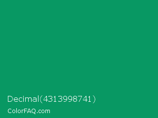 Decimal 4313998741 Color is a normal green color and the nearest color is Green Cyan #009966. Hex code #089863 and RGB value is rgb(8,152,99). In RGB color space, this color is composed of 3% red, 60% green, 39% blue, In CMYK color space, this color is composed of 95% cyan, 0% magenta, 35% yellow , 40% black , In HSL color space, this color has a hue angle of 158° , 90% saturation and 31% lightness.