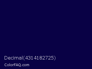 Decimal 4314182725 Color is a very dark indigo color and the nearest color is Stratos #000741. Hex code #090145 and RGB value is rgb(9,1,69). In RGB color space, this color is composed of 4% red, 0% green, 27% blue, In CMYK color space, this color is composed of 87% cyan, 99% magenta, 0% yellow , 73% black , In HSL color space, this color has a hue angle of 247° , 97% saturation and 14% lightness.
