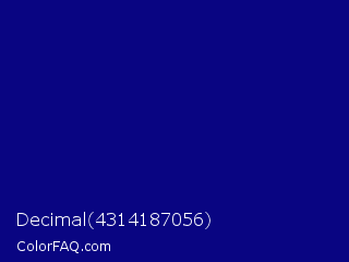 Decimal 4314187056 Color is a dark indigo color and the nearest color is Navy Blue #000080. Hex code #090582 and RGB value is rgb(9,5,130). In RGB color space, this color is composed of 4% red, 2% green, 51% blue, In CMYK color space, this color is composed of 93% cyan, 96% magenta, 0% yellow , 49% black , In HSL color space, this color has a hue angle of 242° , 93% saturation and 26% lightness.
