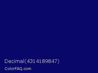 Decimal 4314189847 Color is a very dark indigo color and the nearest color is Arapawa #110c6c. Hex code #090769 and RGB value is rgb(9,7,105). In RGB color space, this color is composed of 4% red, 3% green, 41% blue, In CMYK color space, this color is composed of 91% cyan, 93% magenta, 0% yellow , 59% black , In HSL color space, this color has a hue angle of 241° , 88% saturation and 22% lightness.