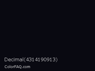 Decimal 4314190913 Color is a almost black blue color and the nearest color is Woodsmoke #0c0d0f. Hex code #090911 and RGB value is rgb(9,9,17). In RGB color space, this color is composed of 4% red, 4% green, 7% blue, In CMYK color space, this color is composed of 47% cyan, 47% magenta, 0% yellow , 93% black , In HSL color space, this color has a hue angle of 240° , 31% saturation and 5% lightness.