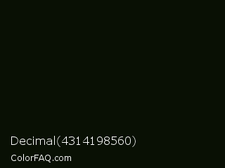 Decimal 4314198560 Color is a almost black green color and the nearest color is Black Forest #0b1304. Hex code #091004 and RGB value is rgb(9,16,4). In RGB color space, this color is composed of 4% red, 6% green, 2% blue, In CMYK color space, this color is composed of 44% cyan, 0% magenta, 75% yellow , 94% black , In HSL color space, this color has a hue angle of 95° , 60% saturation and 4% lightness.