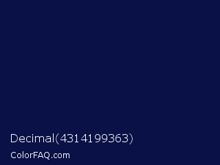Decimal 4314199363 Color is a very dark blue color and the nearest color is Deep Cove #051040. Hex code #091147 and RGB value is rgb(9,17,71). In RGB color space, this color is composed of 4% red, 7% green, 28% blue, In CMYK color space, this color is composed of 87% cyan, 76% magenta, 0% yellow , 72% black , In HSL color space, this color has a hue angle of 232° , 78% saturation and 16% lightness.