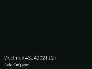 Decimal 4314202112 Color is a almost black green color and the nearest color is Black Bean #081910. Hex code #091310 and RGB value is rgb(9,19,16). In RGB color space, this color is composed of 4% red, 7% green, 6% blue, In CMYK color space, this color is composed of 53% cyan, 0% magenta, 16% yellow , 93% black , In HSL color space, this color has a hue angle of 162° , 36% saturation and 5% lightness.