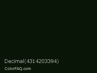 Decimal 4314203394 Color is a almost black green color and the nearest color is Black Forest #0b1304. Hex code #091506 and RGB value is rgb(9,21,6). In RGB color space, this color is composed of 4% red, 8% green, 2% blue, In CMYK color space, this color is composed of 57% cyan, 0% magenta, 71% yellow , 92% black , In HSL color space, this color has a hue angle of 108° , 56% saturation and 5% lightness.