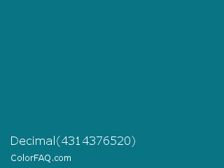 Decimal 4314376520 Color is a dark cyan color and the nearest color is Blue Lagoon #017987. Hex code #097484 and RGB value is rgb(9,116,132). In RGB color space, this color is composed of 4% red, 45% green, 52% blue, In CMYK color space, this color is composed of 93% cyan, 12% magenta, 0% yellow , 48% black , In HSL color space, this color has a hue angle of 188° , 87% saturation and 28% lightness.