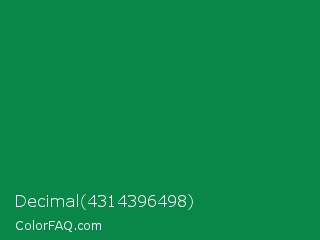 Decimal 4314396498 Color is a dark green color and the nearest color is Salem #097f4b. Hex code #098748 and RGB value is rgb(9,135,72). In RGB color space, this color is composed of 4% red, 53% green, 28% blue, In CMYK color space, this color is composed of 93% cyan, 0% magenta, 47% yellow , 47% black , In HSL color space, this color has a hue angle of 150° , 88% saturation and 28% lightness.