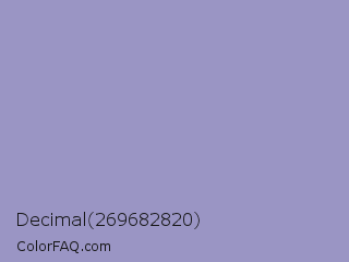 Decimal 269682820 Color is a light indigo color and the nearest color is Blue Bell Crayola #9999cc. Hex code #9a95c4 and RGB value is rgb(154,149,196). In RGB color space, this color is composed of 60% red, 58% green, 77% blue, In CMYK color space, this color is composed of 21% cyan, 24% magenta, 0% yellow , 23% black , In HSL color space, this color has a hue angle of 246° , 28% saturation and 68% lightness.
