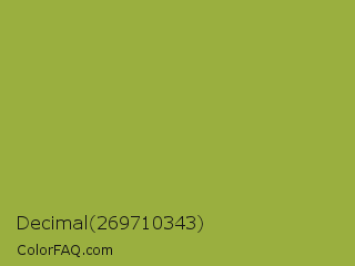 Decimal 269710343 Color is a normal lime color and the nearest color is Sushi #87ab39. Hex code #9aaf3f and RGB value is rgb(154,175,63). In RGB color space, this color is composed of 60% red, 69% green, 25% blue, In CMYK color space, this color is composed of 12% cyan, 0% magenta, 64% yellow , 31% black , In HSL color space, this color has a hue angle of 71° , 47% saturation and 47% lightness.