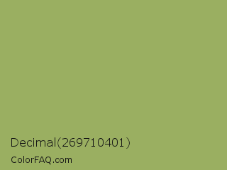 Decimal 269710401 Color is a normal lime color and the nearest color is Green Smoke #a4af6e. Hex code #9aaf61 and RGB value is rgb(154,175,97). In RGB color space, this color is composed of 60% red, 69% green, 38% blue, In CMYK color space, this color is composed of 12% cyan, 0% magenta, 45% yellow , 31% black , In HSL color space, this color has a hue angle of 76° , 33% saturation and 53% lightness.