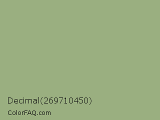 Decimal 269710450 Color is a normal green color and the nearest color is Sage #9ea587. Hex code #9aaf80 and RGB value is rgb(154,175,128). In RGB color space, this color is composed of 60% red, 69% green, 50% blue, In CMYK color space, this color is composed of 12% cyan, 0% magenta, 27% yellow , 31% black , In HSL color space, this color has a hue angle of 87° , 23% saturation and 59% lightness.