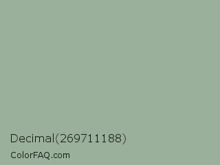 Decimal 269711188 Color is a light green color and the nearest color is Pewter #96a8a1. Hex code #9ab09a and RGB value is rgb(154,176,154). In RGB color space, this color is composed of 60% red, 69% green, 60% blue, In CMYK color space, this color is composed of 13% cyan, 0% magenta, 13% yellow , 31% black , In HSL color space, this color has a hue angle of 120° , 12% saturation and 65% lightness.