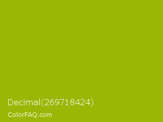 Decimal 269718424 Color is a normal yellow color and the nearest color is Pistachio Green #9dc209. Hex code #9ab706 and RGB value is rgb(154,183,6). In RGB color space, this color is composed of 60% red, 72% green, 2% blue, In CMYK color space, this color is composed of 16% cyan, 0% magenta, 97% yellow , 28% black , In HSL color space, this color has a hue angle of 70° , 94% saturation and 37% lightness.