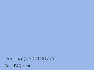 Decimal 269719077 Color is a light blue color and the nearest color is Pale Cerulean #9bc4e2. Hex code #9ab7e9 and RGB value is rgb(154,183,233). In RGB color space, this color is composed of 60% red, 72% green, 91% blue, In CMYK color space, this color is composed of 34% cyan, 21% magenta, 0% yellow , 9% black , In HSL color space, this color has a hue angle of 218° , 64% saturation and 76% lightness.