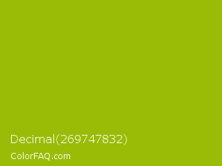 Decimal 269747832 Color is a normal lime color and the nearest color is Pistachio Green #9dc209. Hex code #9abc06 and RGB value is rgb(154,188,6). In RGB color space, this color is composed of 60% red, 74% green, 2% blue, In CMYK color space, this color is composed of 18% cyan, 0% magenta, 97% yellow , 26% black , In HSL color space, this color has a hue angle of 71° , 94% saturation and 38% lightness.