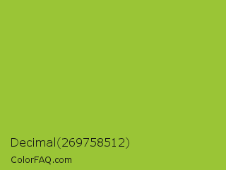 Decimal 269758512 Color is a normal lime color and the nearest color is Yellow Green #9acd32. Hex code #9ac536 and RGB value is rgb(154,197,54). In RGB color space, this color is composed of 60% red, 77% green, 21% blue, In CMYK color space, this color is composed of 22% cyan, 0% magenta, 73% yellow , 23% black , In HSL color space, this color has a hue angle of 78° , 57% saturation and 49% lightness.